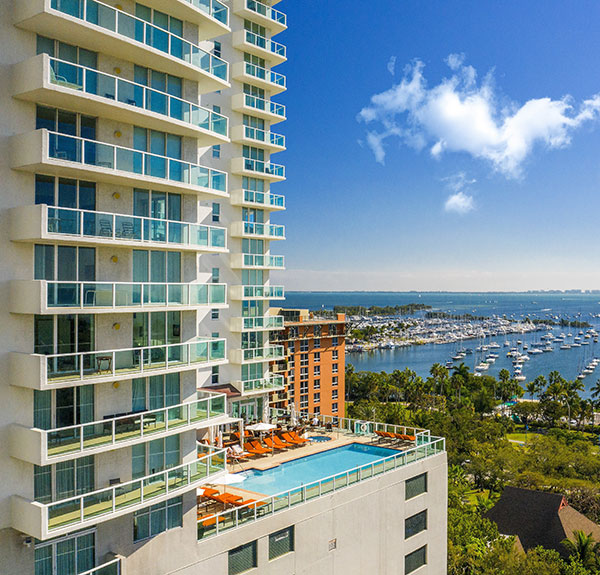 Located along the waterfront in Coconut Grove, Miami, FL, Arya Hotel & Suites, offers a refined resort experience where urban sophistication meets tropical ease. Overlooking Biscayne Bay and surrounded by lush greenery, this upscale retreat blends contemporary comfort with a relaxed coastal atmosphere. Spacious suites featuring private balconies, floor to ceiling windows, and fully equipped kitchens create a residential feel ideal for both short escapes and extended stays.